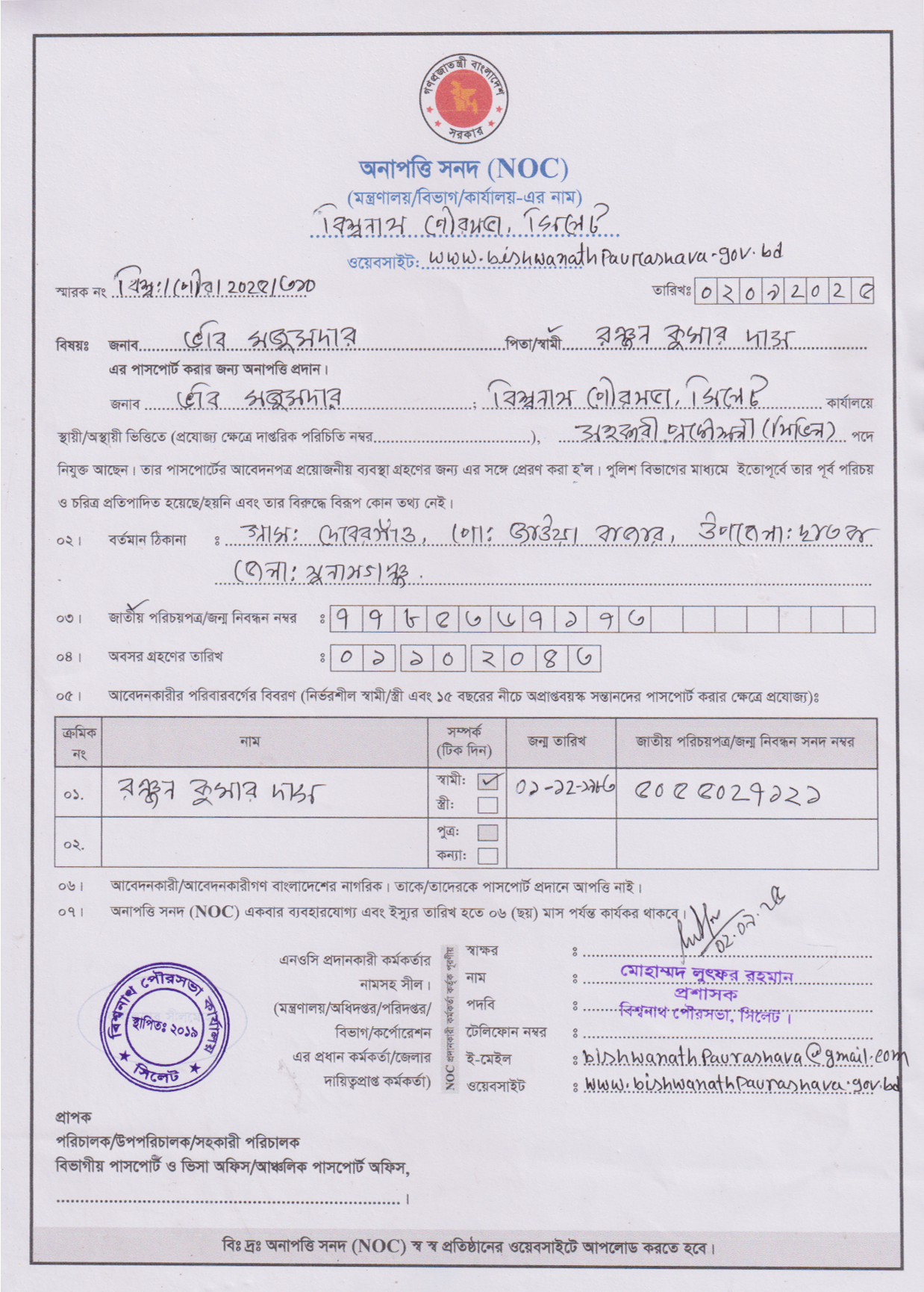 জনাব ভবি মজুমদার, সহকারী প্রকৌশলী এর পাসপোর্ট করার জন্য অনাপত্তি প্রদান।